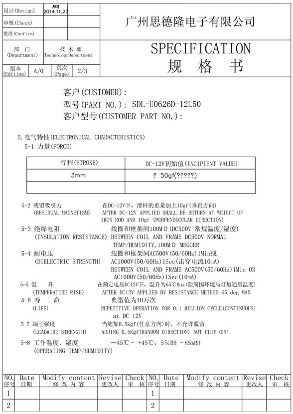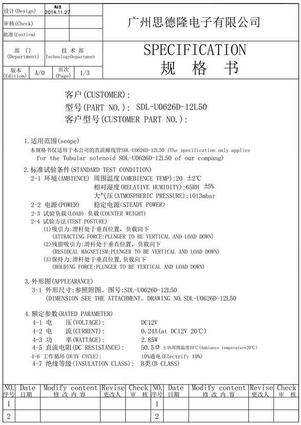 | 电压: | DC12V | 行程: | 10mm | 电阻: | 50.5欧 | 功率: | 2.85W |